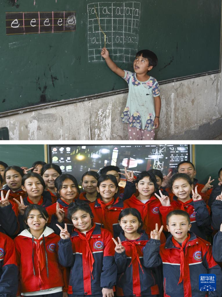 拼版照片:上图为搬迁前,达里雅布依村学生努尔尼沙汗·卡司木在学校课堂上(2018年9月5日摄);下图为努尔尼沙汗(前排,左二)在于田县第二中学与六年级五班的同学合影(2024年11月11日摄)。