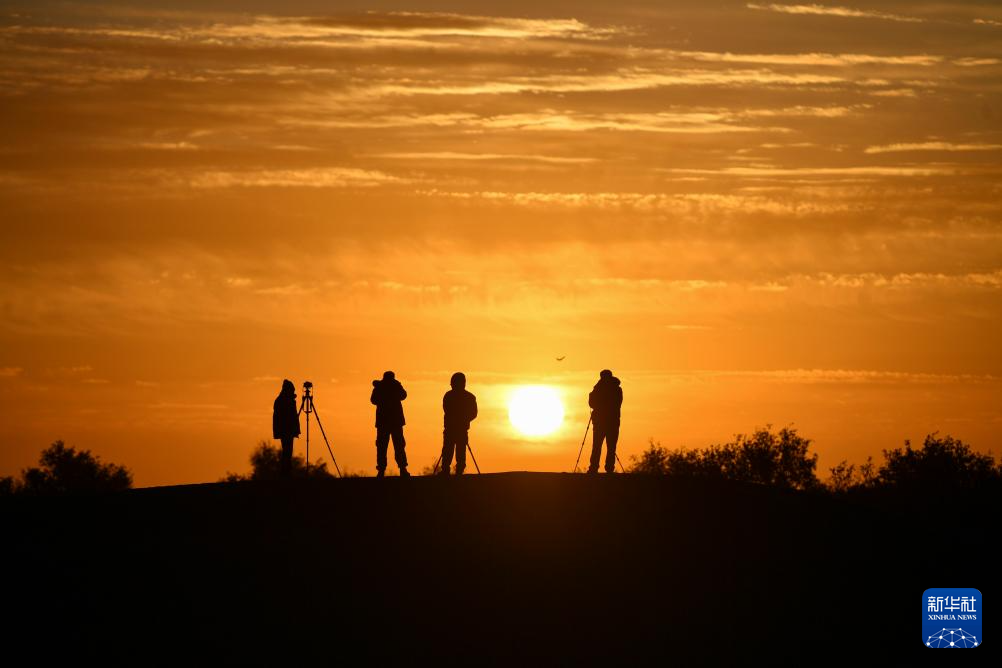 游客在新疆于田县达里雅布依旧址景区拍摄胡杨林日出风景(2024年11月7日摄)。