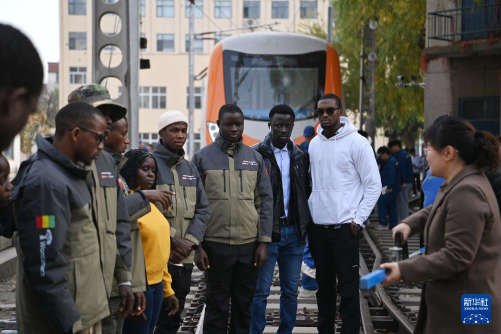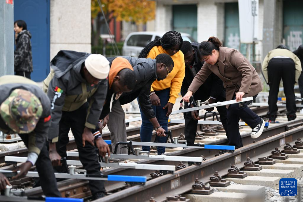 在天津铁道职业技术学院,老师指导几内亚学员使用铁路轨距尺(11月11日摄)。