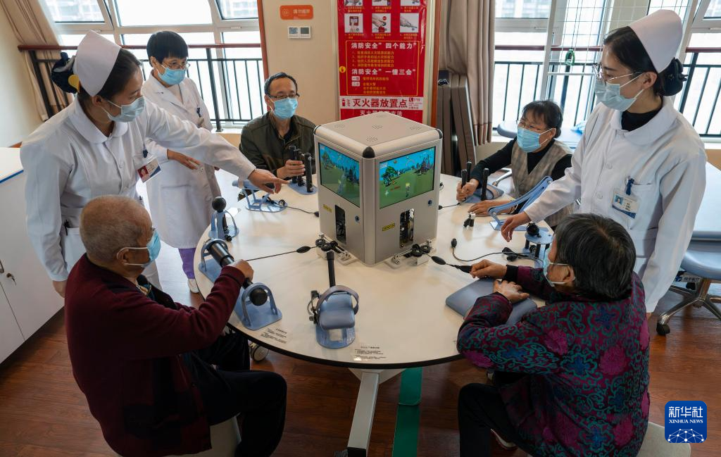 11月11日,在日照市泰安路社区养老服务中心(日照颐养健康中心),老人在护理人员帮助下做康复训练游戏。
