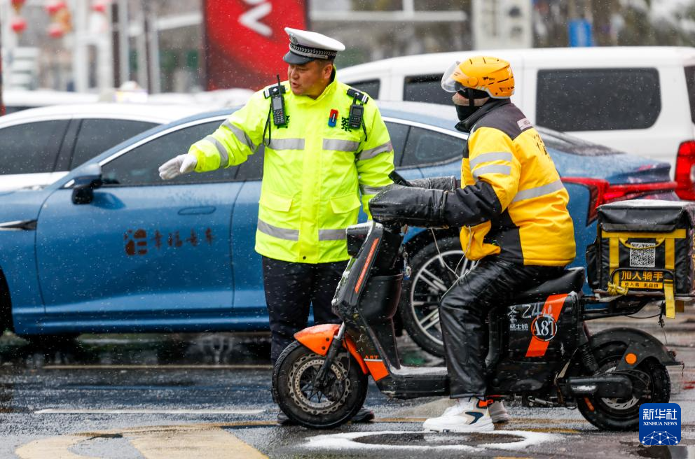 11月14日,乌鲁木齐市公安局交警支队天山区大队新华路中队民警在西大桥执勤点提醒外卖员骑行时注意防滑。