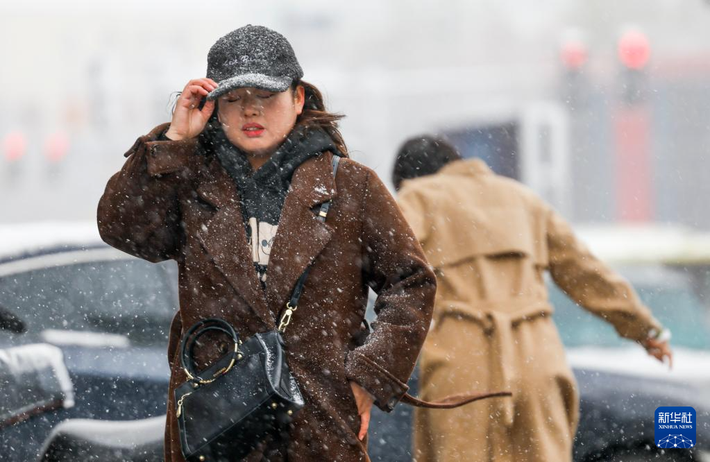 11月14日,在乌鲁木齐市光明路附近,市民走在风雪中。