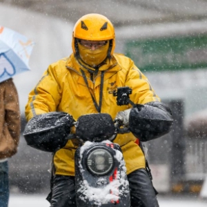 11月14日,在乌鲁木齐市光明路附近,外卖员在风雪中骑行。