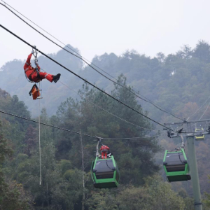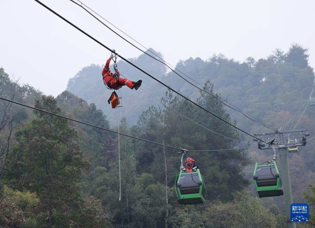 11月13日,湖南省张家界国家森林公园组织开展索道高空联合救援模拟演练,检验索道安全性能及营运单位应对突发索道应急事件的处置水平,提高旅游接待安全保障能力。