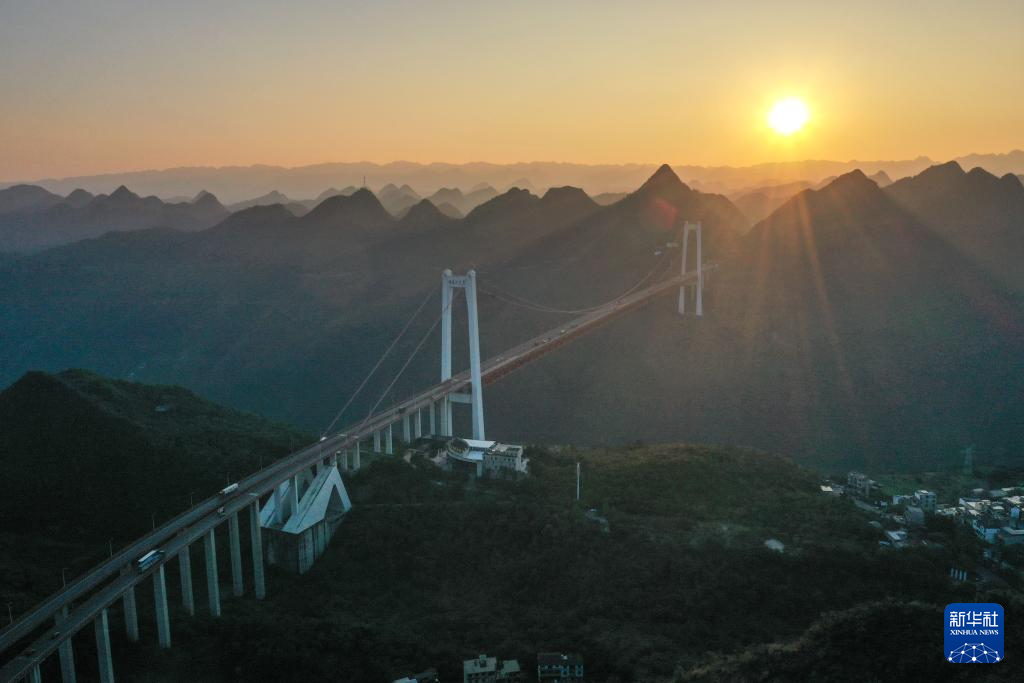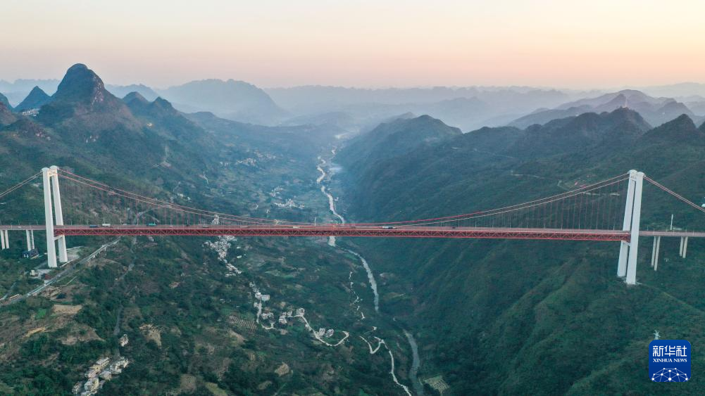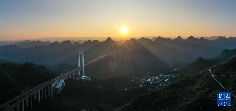 11月14日拍摄的晨曦中的贵州坝陵河大桥(无人机照片)。