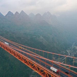 位于贵州省安顺市境内的坝陵河大桥全长2237米,主跨1088米,距河面垂直高度370米,是上海至瑞丽高速公路贵州境内镇宁至云南胜境关高速公路上跨越坝陵河大峡谷的桥梁。