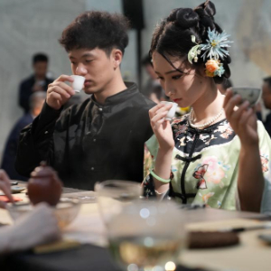 11月14日,人们在杭州秋季茶博会上举行的一场茶会中品茶。
