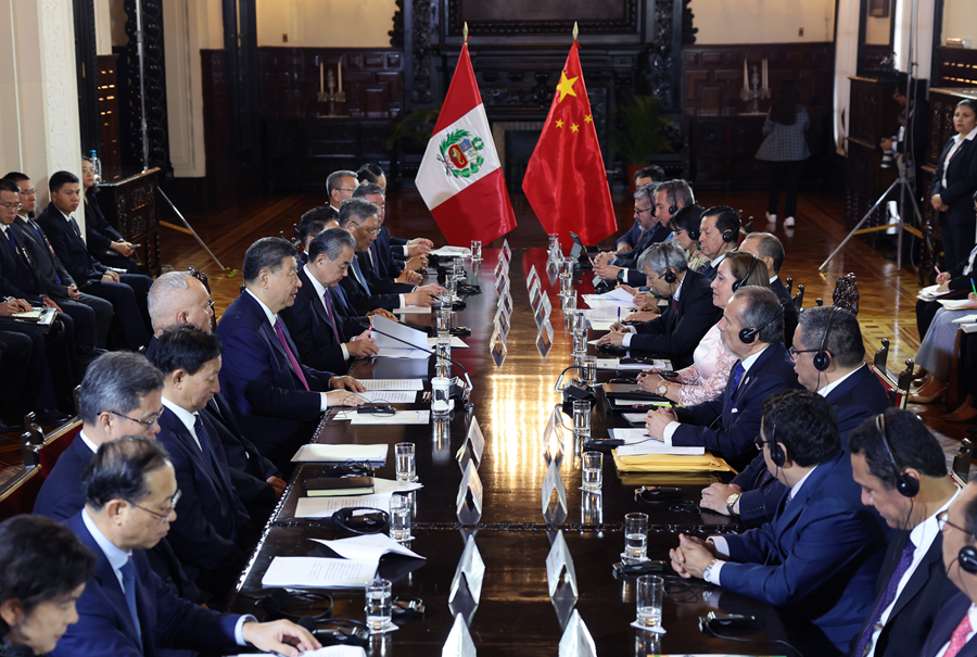 当地时间11月14日下午,国家主席习近平在利马总统府同秘鲁总统博鲁阿尔特举行会谈。