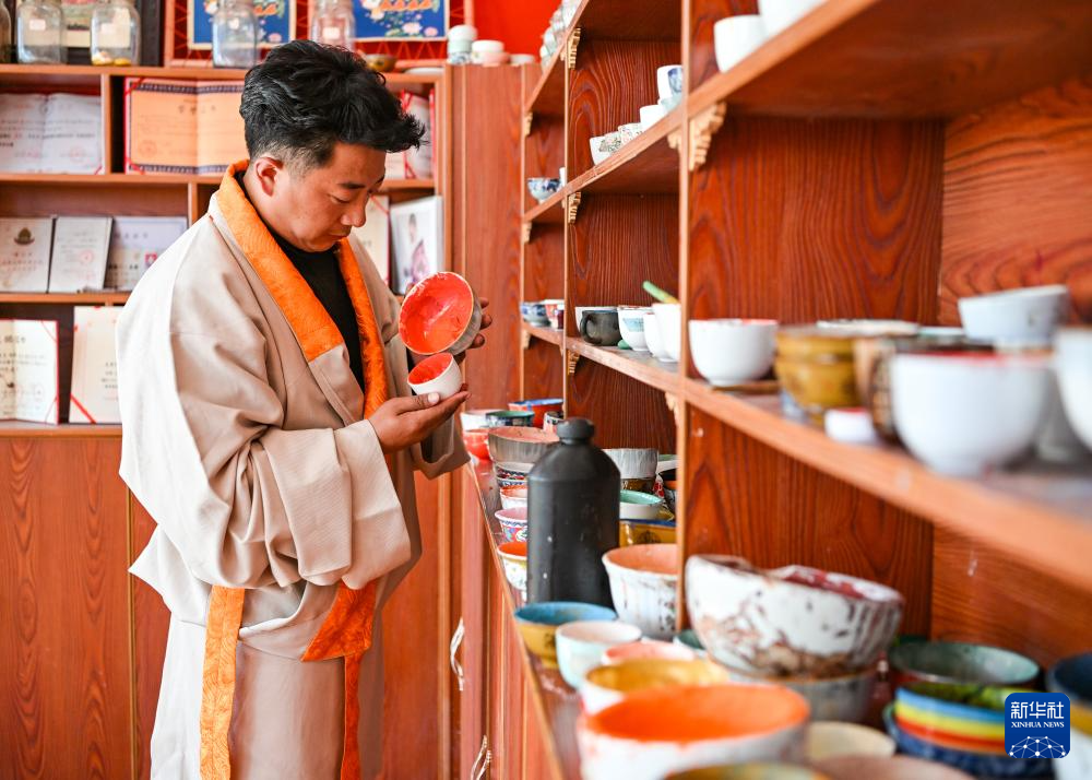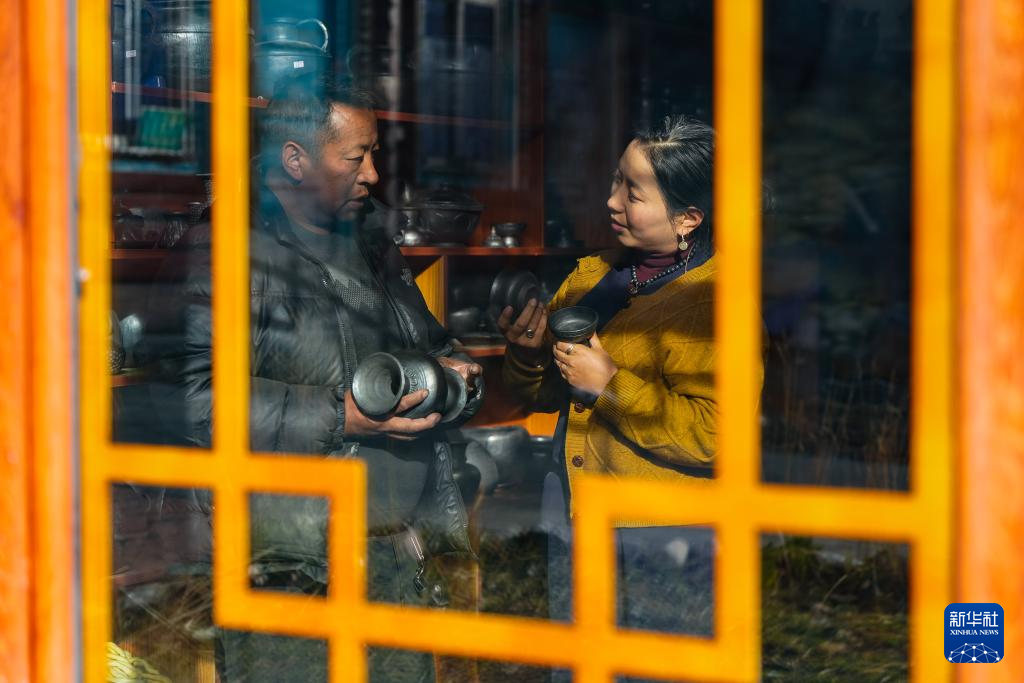 在德格县麦宿镇的扎堪仓黑陶工坊,达瓦卓玛(右)向工坊主理人降拥格乃了解工坊近期的经营情况以及新品研制进展(11月4日摄)。达瓦卓玛经常会与麦宿镇的其他手工艺者交流经营中遇到的问题,想办法帮他们解决。