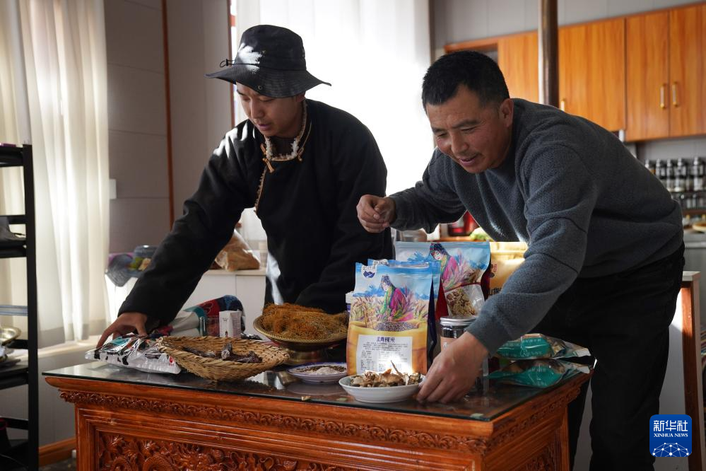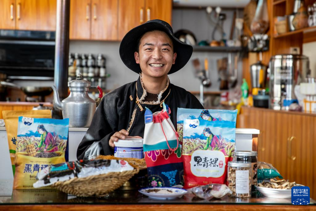 11月3日,在四川省甘孜藏族自治州理塘县甲洼镇,达洼在展示直播售卖的商品。