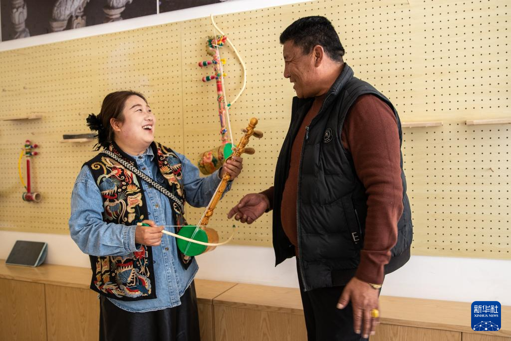 11月5日,在四川省甘孜藏族自治州巴塘县,南戈村党支部书记益西泽仁在村史馆教刘莎莎拉南戈弦胡。