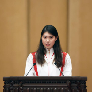 11月15日,游泳运动员张雨霏在报告会上发言。