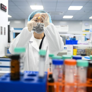 在盛世泰科生物医药技术(苏州)有限公司实验室,工作人员观察化合物配制状态(11月12日摄)。