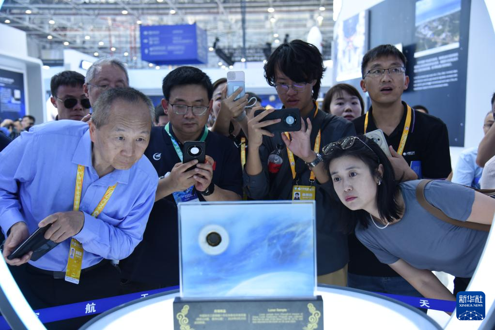 11月12日,观众在近距离观察拍摄嫦娥六号取自月球背面的土壤样品。