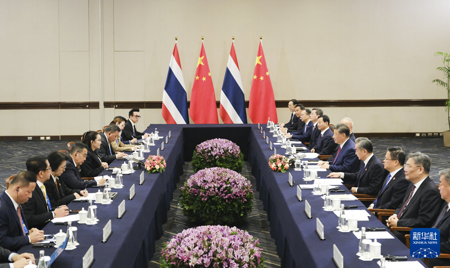 当地时间11月15日上午,国家主席习近平在利马出席亚太经合组织领导人非正式会议期间会见泰国总理佩通坦。