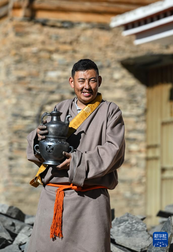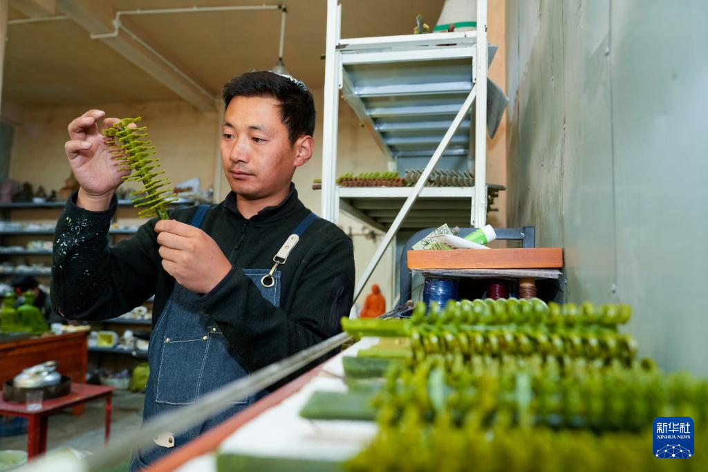 达瓦扎巴在检查新款钦乐利玛铜文创产品的蜡模(11月3日摄)。达瓦扎巴1992年出生在四川省甘孜藏族自治州德格县麦宿镇一个手工艺家庭,其家族有约两百年制作利玛铜铸制品的历史。达瓦扎巴从小跟随父亲尼玛学习。如今,他已是非遗项目“藏族金属锻造技艺”四川省甘孜州代表性传承人。达瓦扎巴在继承传统工艺的同时,开发创作时尚文创产品,将藏族传统手工艺推向国际市场。目前,其家族的“钦乐工坊”有全职手艺人约40名。
