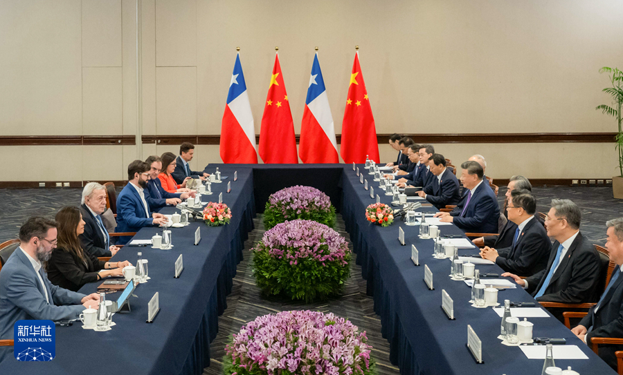当地时间11月15日下午,国家主席习近平在利马出席亚太经合组织领导人非正式会议期间会见智利总统博里奇。