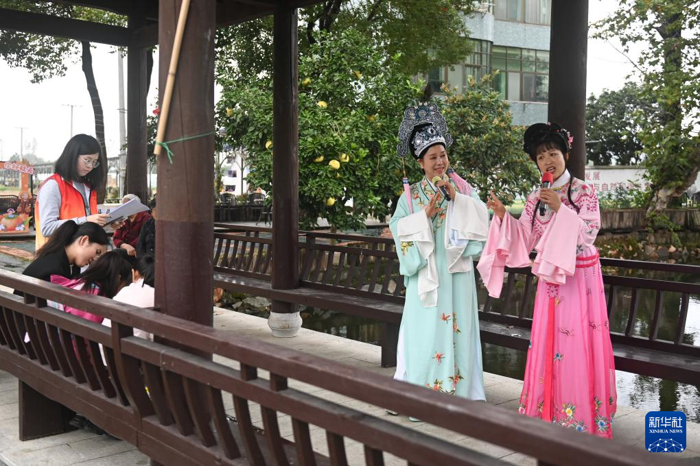 11月16日,青年志愿者在姚江镇山汀村协助亲子家庭竞猜越剧选段。