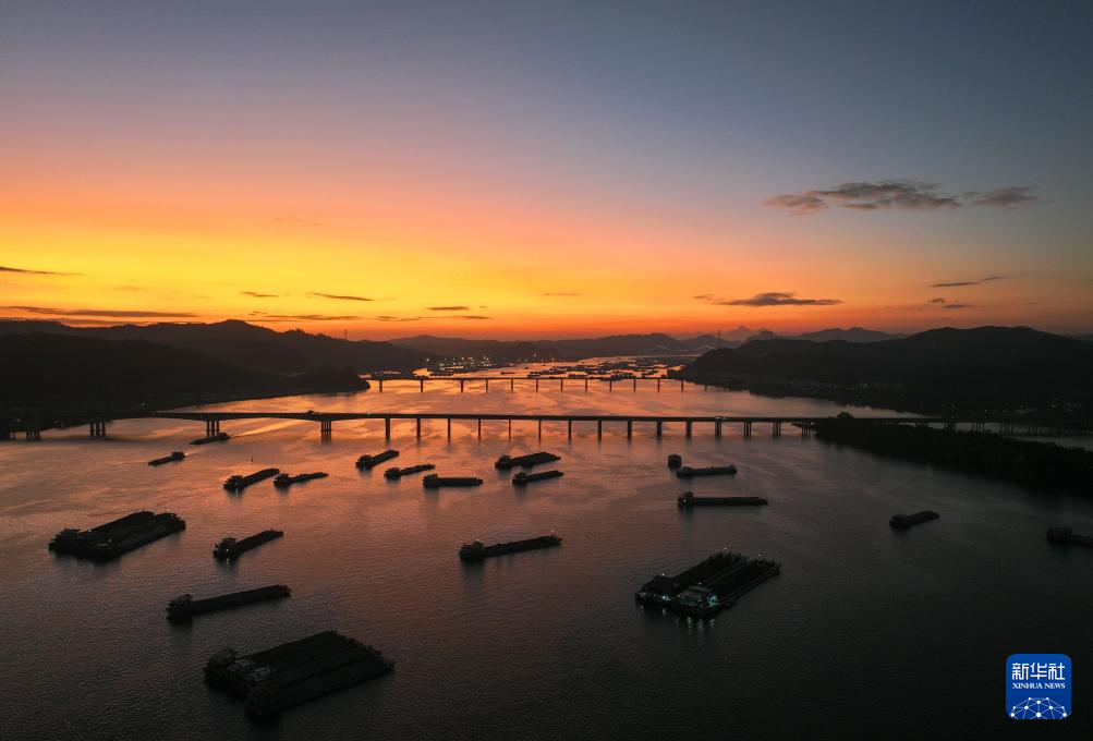这是广西梧州市长洲区长洲镇泗洲村附近的西江夕阳景色(11月15日摄,无人机照片)。
