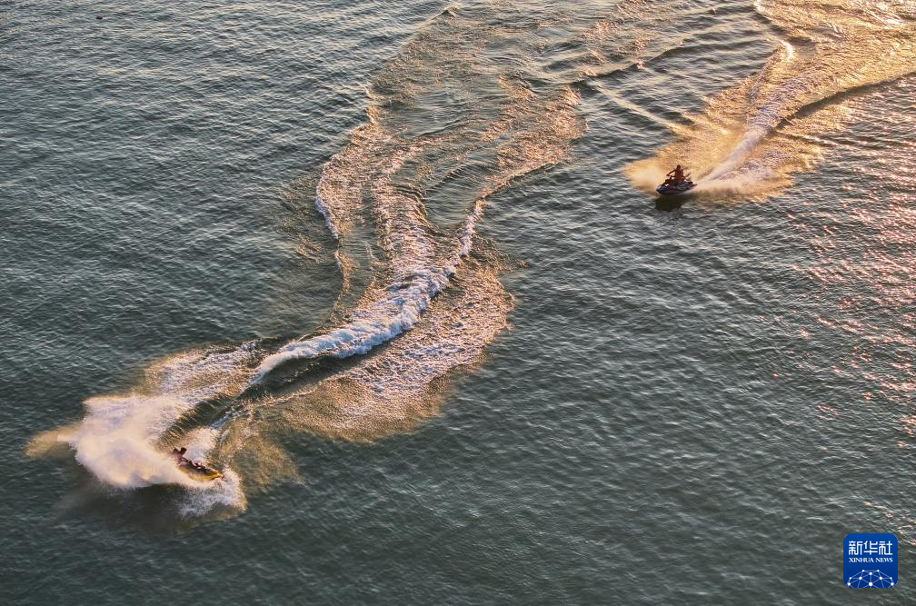 广西梧州市长洲区长洲镇泗洲村,游客在西江上体验摩托艇运动(无人机照片,11月13日摄)。