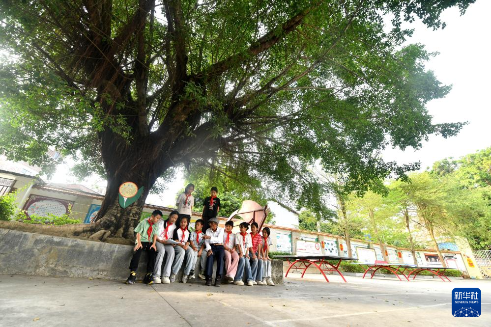 自治区级非遗传承人陈明仲(前排右五)在广西梧州市长洲区长洲镇泗洲小学教学生唱下俚歌(11月14日摄)。