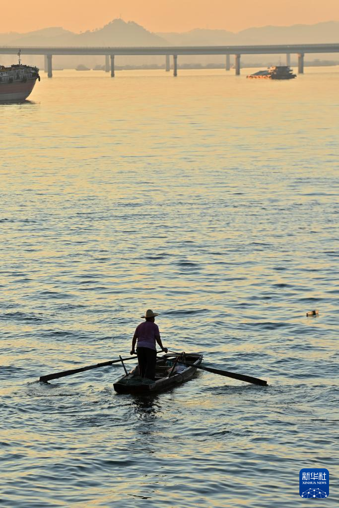 广西梧州市长洲区长洲镇泗洲村,村民在西江上划船(11月12日摄)。