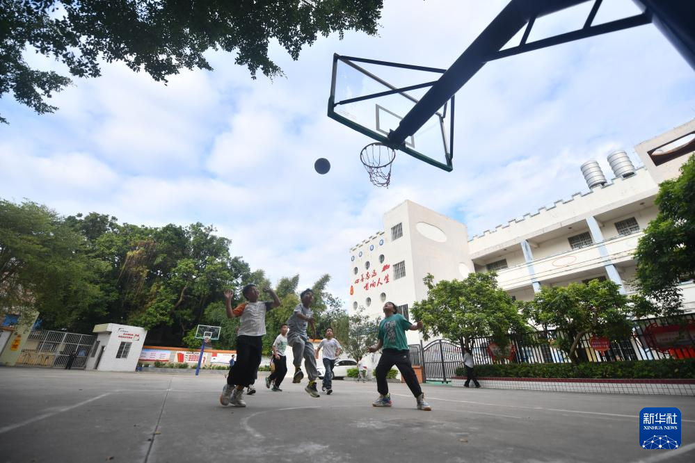 在广西梧州市长洲区长洲镇泗洲小学,孩子们在课外活动中打篮球(11月14日摄)。