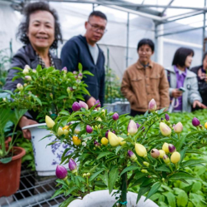 11月18日,在浙江省杭州市钱塘区的“勿忘农集团科研中心”,杭城市民代表、杭州市农业农村局的农技专家参观“阳台菜园”品种展,交流“阳台菜园”种植心得。