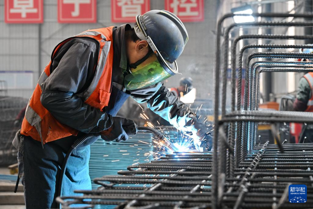 11月19日,中铁十一局集团工人在位于河北省南宫市的雄商高铁站前六标段混凝土构配件智能预制中心内进行焊接作业。