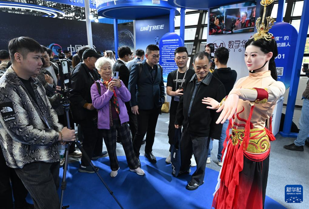 11月19日,在2024年世界互联网大会“互联网之光”博览会上,一台人形机器人(右一)与参观者互动。
