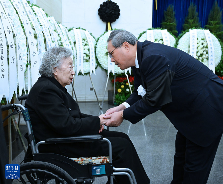 11月18日,梁光烈同志遗体在北京八宝山革命公墓火化。受中共中央委托,李强、丁薛祥、韩正等到八宝山革命公墓为梁光烈同志送别,并慰问其亲属。这是李强与梁光烈亲属握手,表示慰问。新华社记者 饶爱民 摄
