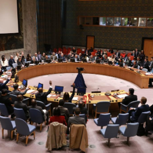 11月20日,在位于纽约的联合国总部,美国常驻联合国副代表罗伯特·伍德(前中)在安理会就决议草案进行表决时投反对票。