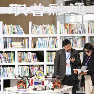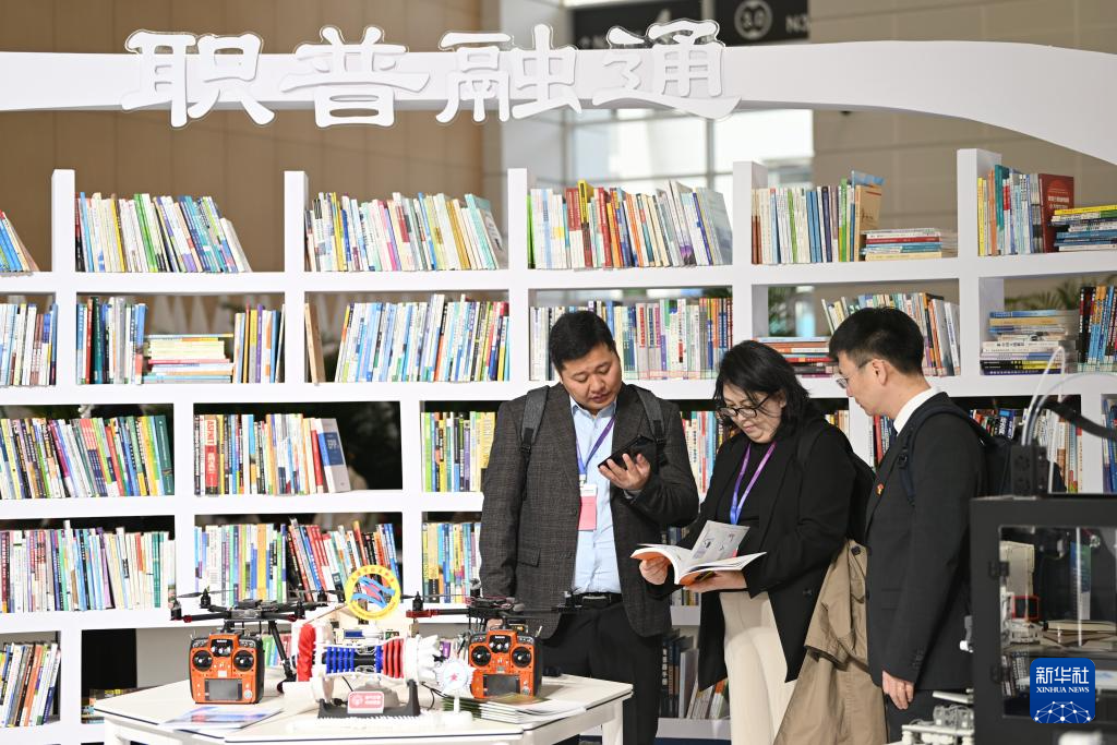 11月21日,参会嘉宾在2024年世界职教大会上翻阅职教书籍。