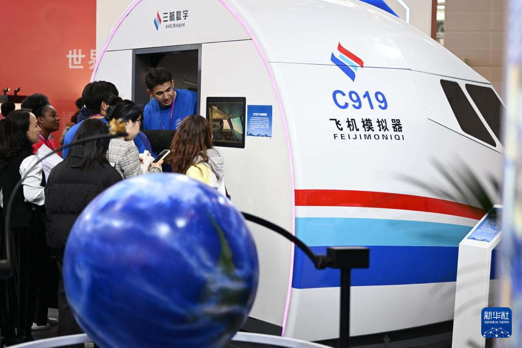 11月21日,参会者在职业教育专题展上参观C919飞机模拟器。