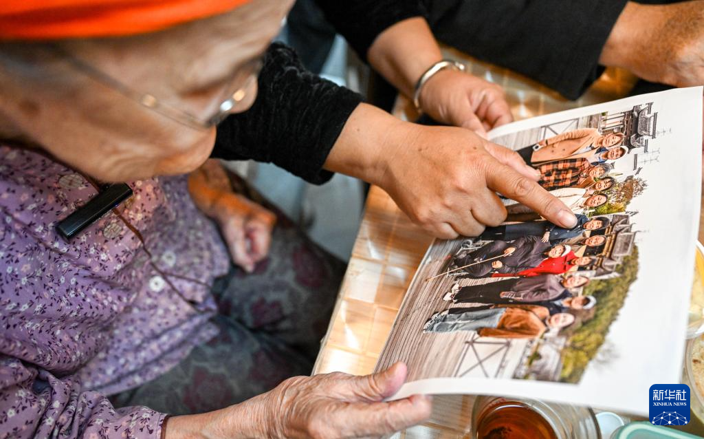 11月20日,扎拉嘎木吉给都贵玛老人介绍自己和江苏亲人的合影。新华社记者 连振 摄pagebreak