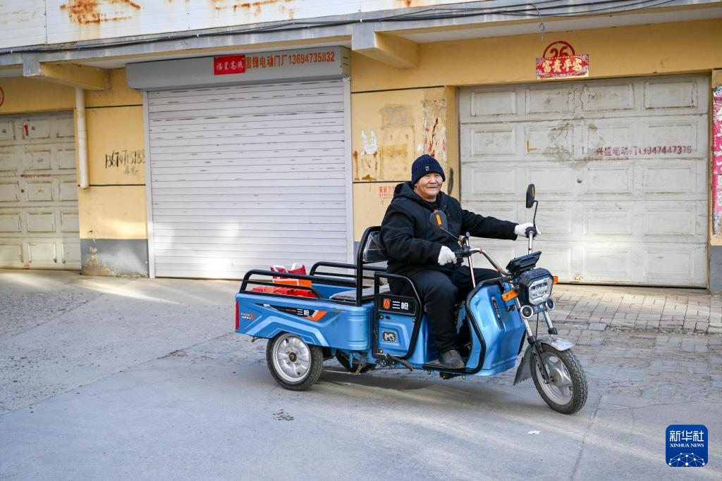 11月20日,扎拉嘎木吉骑上三轮车,去看望都贵玛老人。新华社记者 连振 摄pagebreak