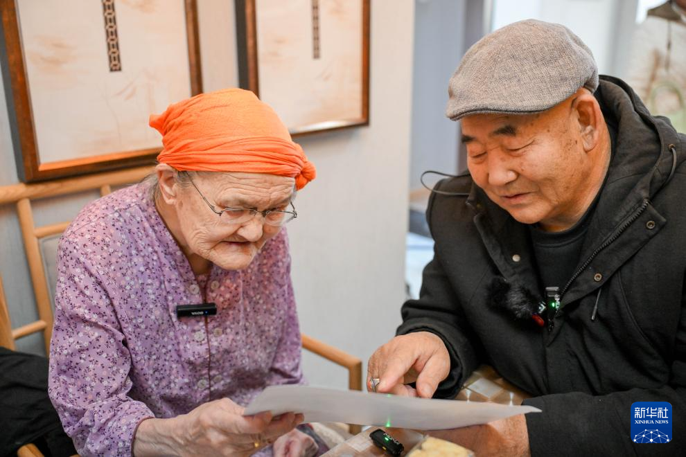 11月20日,扎拉嘎木吉(右)给都贵玛老人介绍自己和江苏亲人的合影。新华社记者 连振 摄pagebreak
