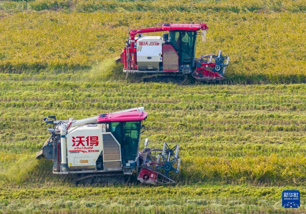 11月22日,在浙江省宁波市镇海区澥浦镇沿山村,农民驾驶农机在田间收割晚稻(无人机照片)。