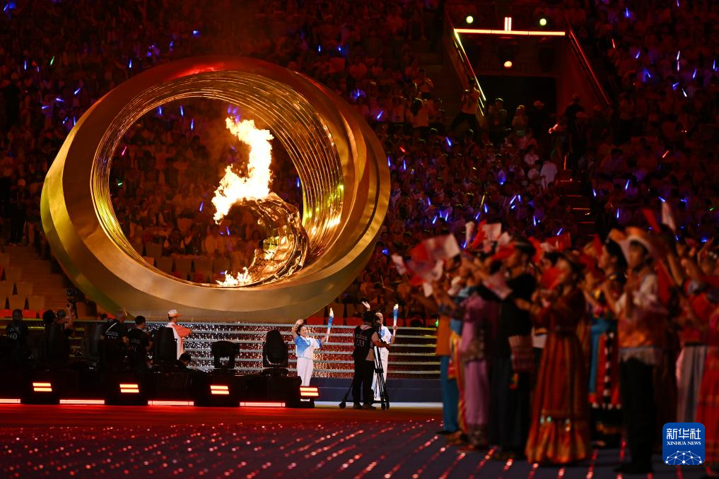 11月22日,火炬手符攀婵(前)与王书茂在开幕式上点燃主火炬。