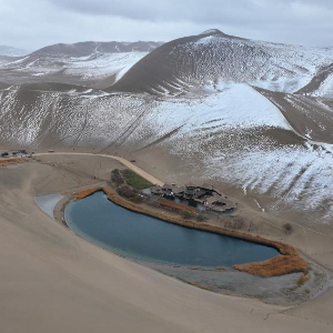 受冷空气影响,11月23日,甘肃省敦煌市迎来入冬以来首场降雪,鸣沙山月牙泉景区雪景如画,美不胜收。