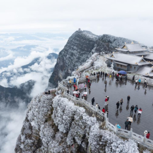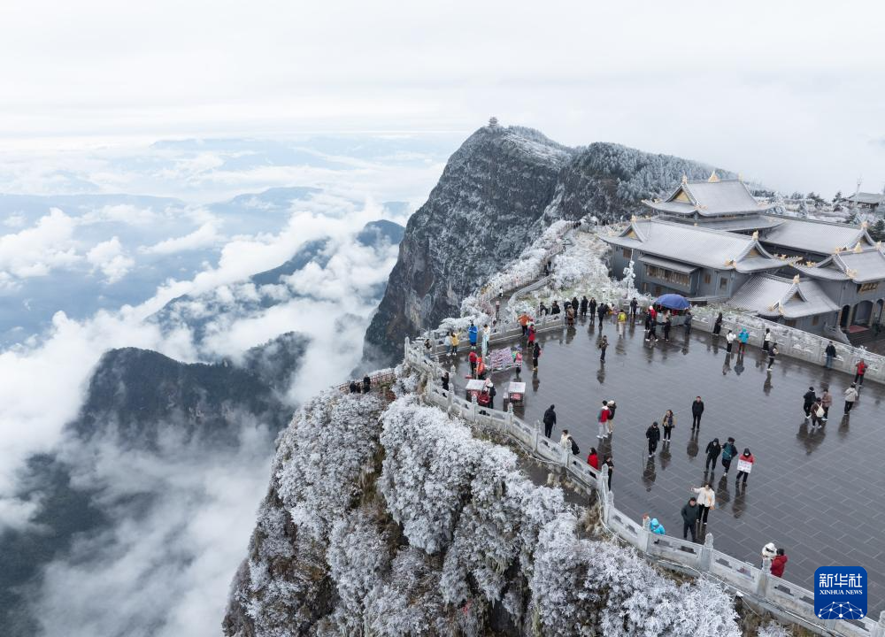 11月20日,游客在峨眉山金顶远眺群峰与云海(无人机照片)。近日,峨眉山迎来今冬第一雪,奇峰、林海、云雾与冰雪绘就了一幅幅银装素裹的美丽画卷。