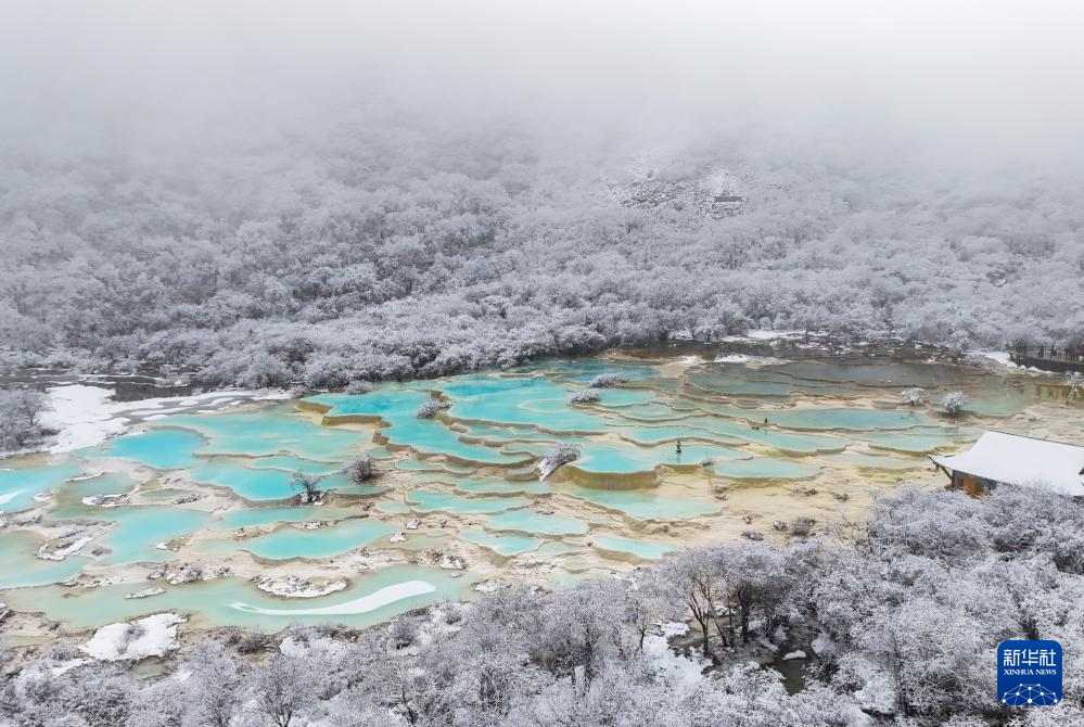 11月18日在四川省阿坝藏族羌族自治州黄龙景区拍摄的五彩池(无人机照片)。雪后的四川省阿坝藏族羌族自治州黄龙景区薄雾弥漫,仿佛披上了一层轻纱,如梦如幻。