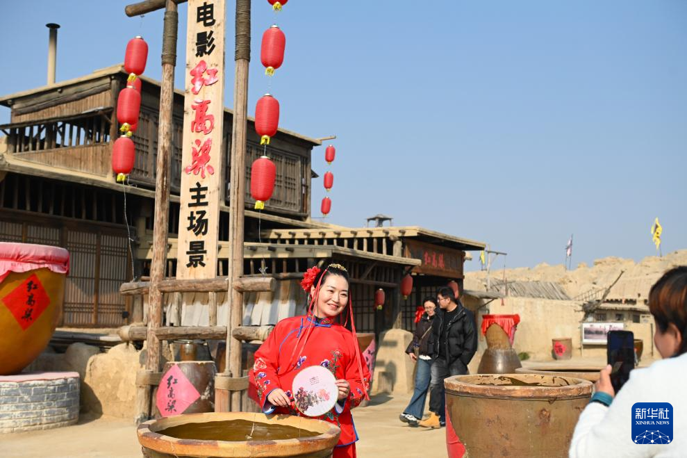 11月23日,在镇北堡西部影城,游客在电影《红高粱》取景地前拍照。