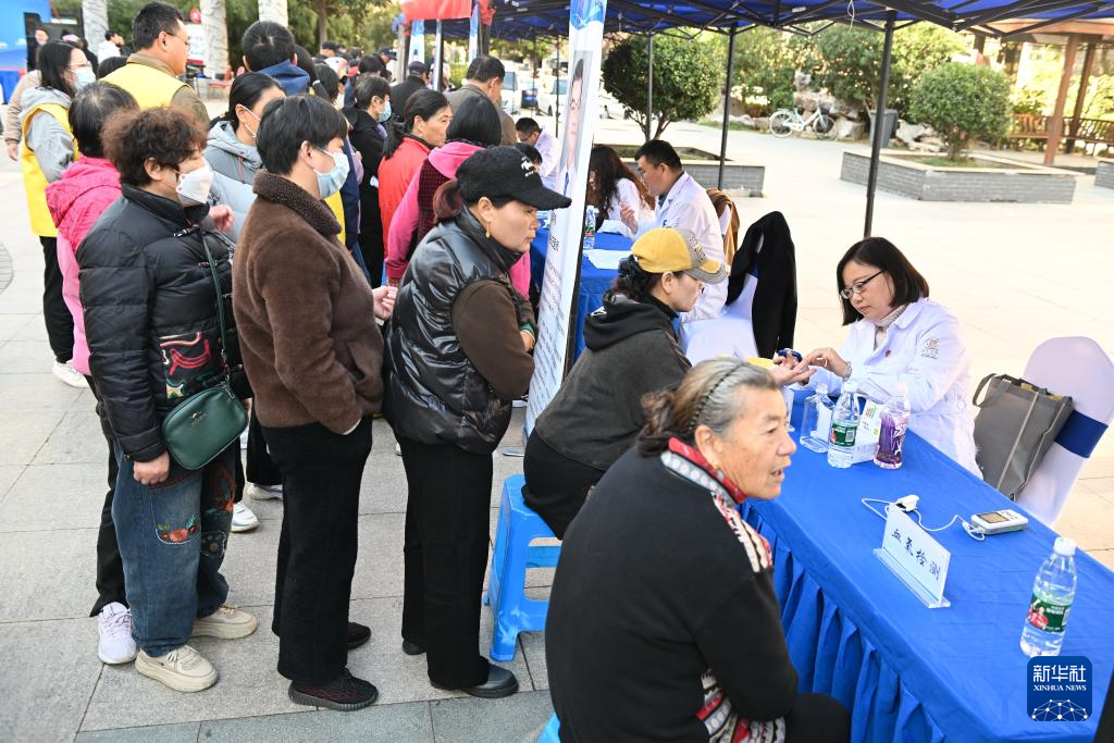 11月23日,在扬州市广陵区汤汪街道九龙村,医务人员为居民检测血糖。