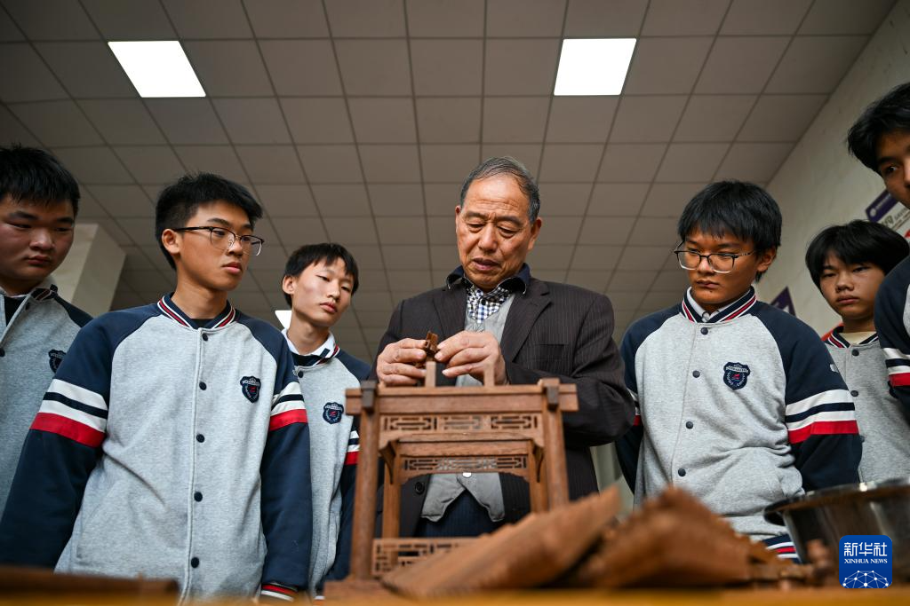 11月22日,在临海市海商职业技术学校,黄大树(中)为学生进行凉亭拼装演示。
