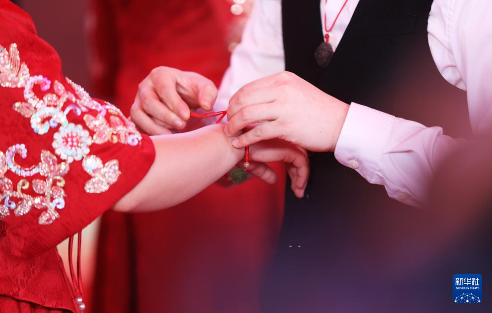 11月23日,在集体婚礼仪式上,一名新郎给新娘佩戴信物。