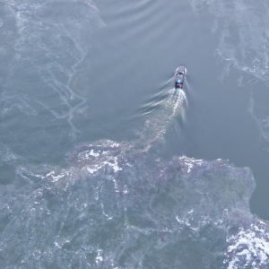 11月24日,在松花江哈尔滨段,一艘小船从流冰旁经过(无人机照片)。