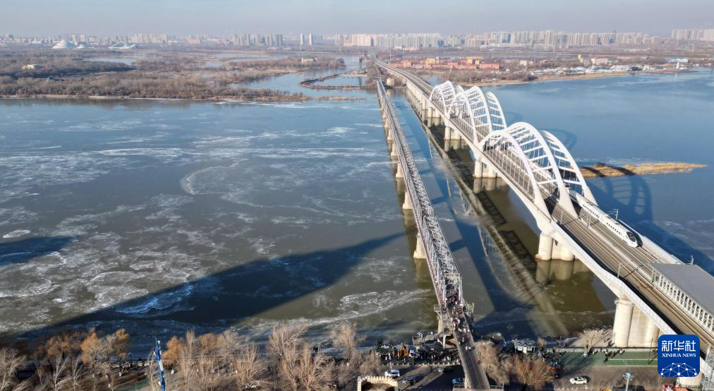 11月23日,流冰通过哈尔滨滨州铁路桥和哈齐客专松花江特大桥(无人机照片)。