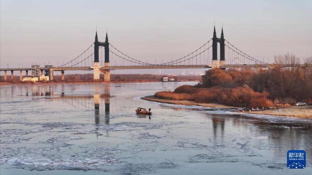 11月24日,在哈尔滨市阳明滩大桥附近的松花江上,一艘小船从流冰旁经过(无人机照片)。