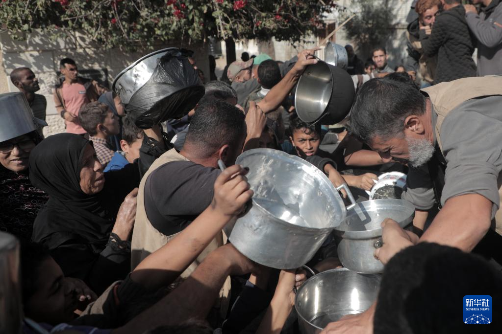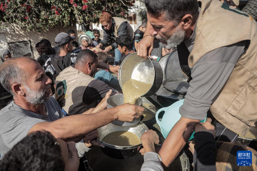 11月23日,巴勒斯坦人在加沙地带中部代尔拜拉赫领取救济食物。